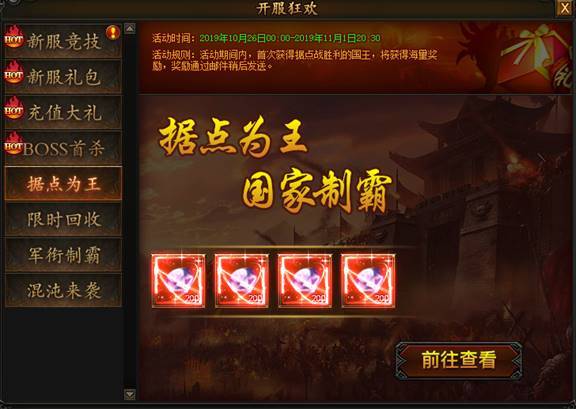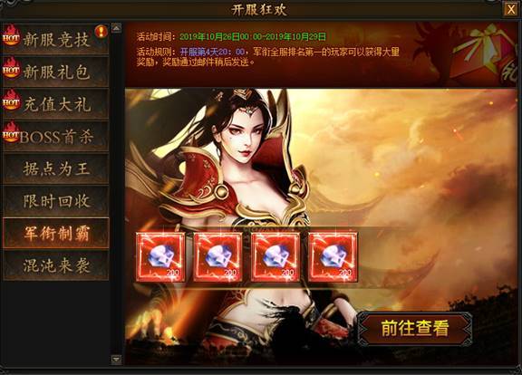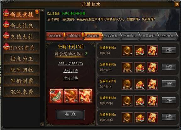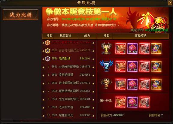 开服前三天,根据玩家的总战力进行排名,领取限定称号和红色装备。
