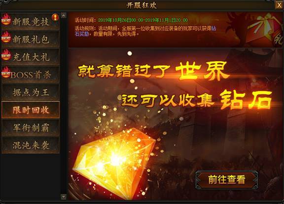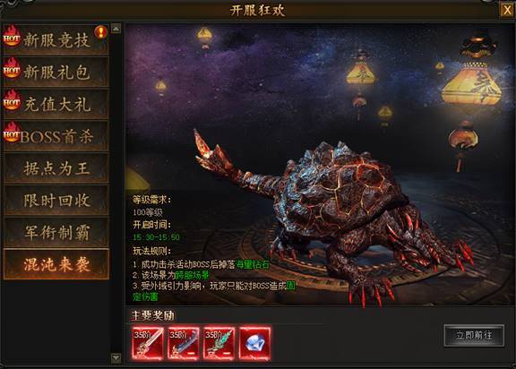 活动期间,每天可击杀混沌BOSS,该BOSS必定掉落红装和钻石。