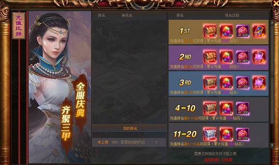 活动期间,充值排行榜将记录每位玩家的充值记录,在活动结束后为排行前100名的玩家发放丰厚的奖励。