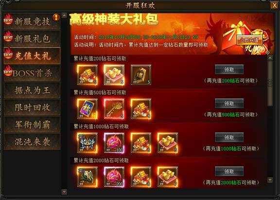 活动期间,充值元宝数量达到指定数额时,即可领取累充反馈奖励。